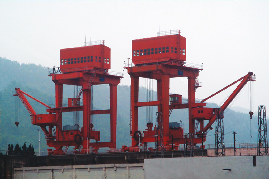 水電站門式起重機是一種門式多功能起重機,主要工作于水電站大壩壩頂或尾平臺,用于發(fā)電機組進水口工作門、排沙底口事故檢修門、攔污柵、泄洪水閘平板工作門等各類閘門的啟閉、搬運,用于機電設(shè)備安裝及壩頂其他設(shè)備的吊運等。大連重工研制的該類產(chǎn)品的主要技術(shù)特點:起重量大(最大1000t)、超載能力強、跨度較?。ǔ?0-20m)、起升高度大、配有自動化或智能化的水下液壓掛梁,可采用各種先進的電氣調(diào)速系統(tǒng)和PLC及網(wǎng)絡(luò)控制系統(tǒng)。