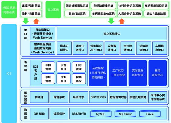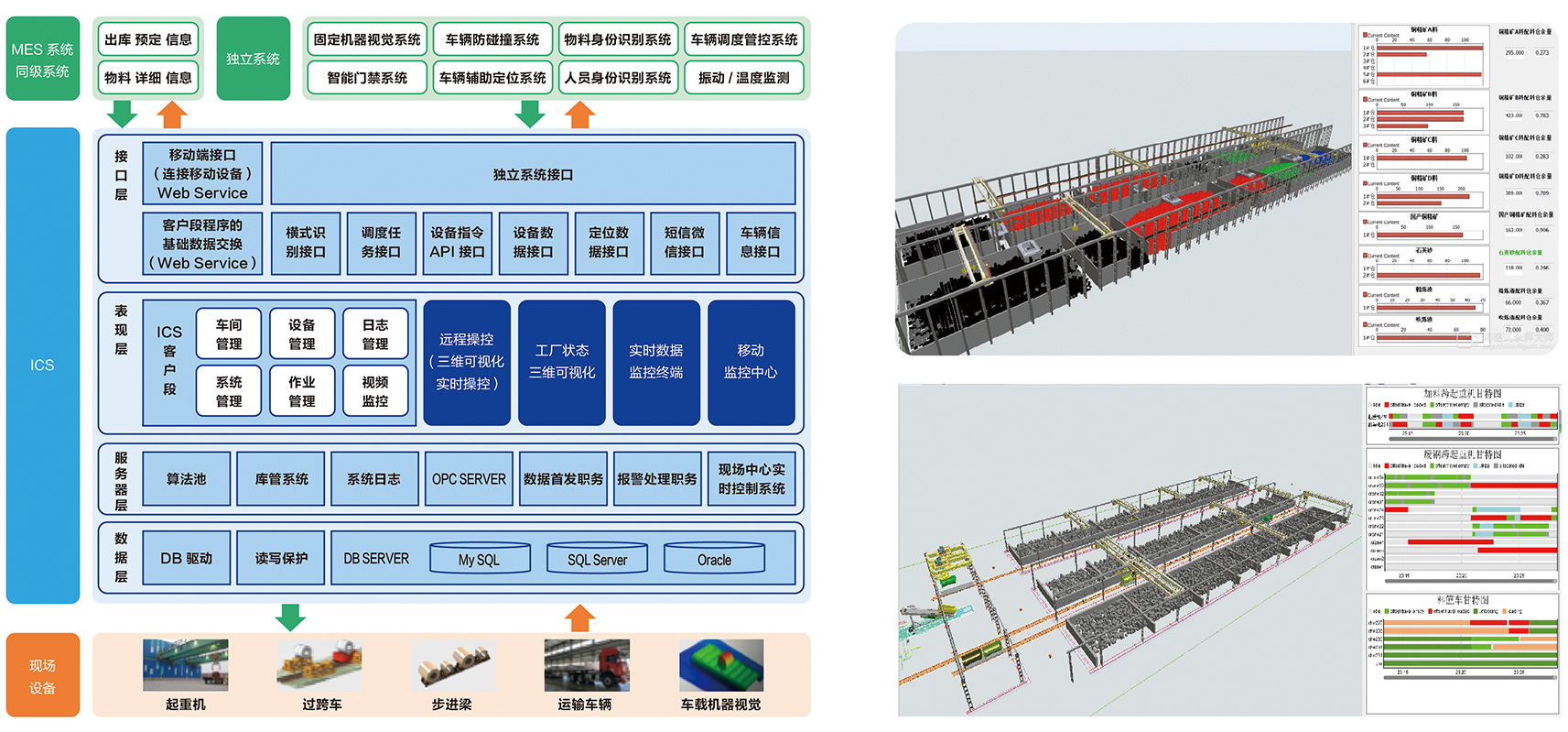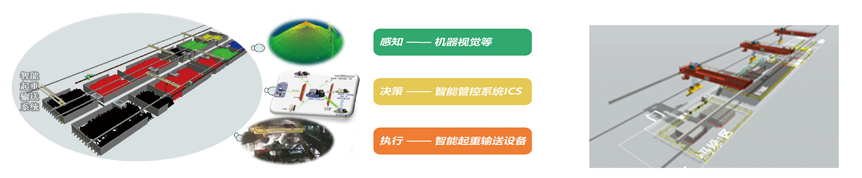 智能起重輸送是包含了庫區(qū)管理、調(diào)度算法、智能搬運等子系統(tǒng),形成了感知、決策、執(zhí)行的智能化整體解決方案。該系統(tǒng)在標(biāo)準(zhǔn)的生產(chǎn)流程、規(guī)范的操作過程的基礎(chǔ)上,通過位置傳感器、機器視覺等感知設(shè)備狀態(tài)、庫存狀態(tài)等環(huán)境信息,經(jīng)庫區(qū)智能管理系統(tǒng)分析后自主分解生產(chǎn)計劃,通過智能調(diào)度、路徑規(guī)劃等技術(shù)形成運行指令,通過自主控制、精確定位等技術(shù)由智能設(shè)備自主完成任務(wù)指令并反饋執(zhí)行結(jié)果。該系統(tǒng)還具有遠程運維、云服務(wù)及移動推送等功能,實現(xiàn)全生命周期管理和現(xiàn)場實時監(jiān)控。